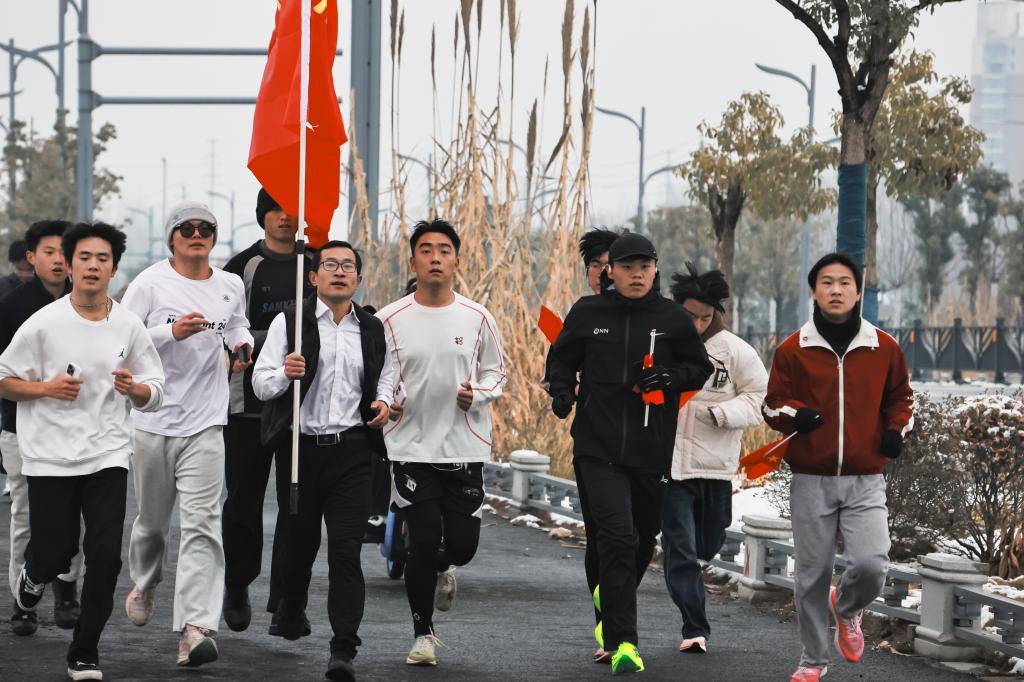学院党工委常务副书记李振东作了热情洋溢的讲话,简要总结回顾了信阳理工学院过去一年的工作成绩,鼓励同学们积极参加体育锻炼,培育生活激情,坚定目标方向,以崭新的面貌迎接新年的到来。师生们从校园初心广场出发,先行绕校园跑步一周,然后从西门出发沿南昌大街、苏信大道、嘉兴大街、大学路,绕至豫东南大道、潢河东路、大学路、南昌大街,返回出发原点初心广场,全程十公里。一路上,师生们精神抖擞欢歌笑语,高举鲜艳的理工学院院旗,在冬日暖阳下欢呼雀跃,一路奔跑,犹如飞舞的长龙,穿梭于优美的校园和豫东南高新区宽阔的道路之间。欢声笑语与加油助威声此起彼伏,蓬勃的朝气与青春的活力尽情绽放,成为新年冬日一道亮丽动人的风景。师生们在奔跑中彼此鼓励、携手前行,用坚定的脚步丈量每一寸土地,以饱满的热情奔赴新的未来。