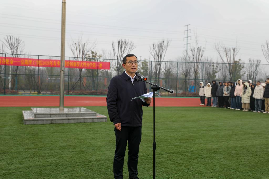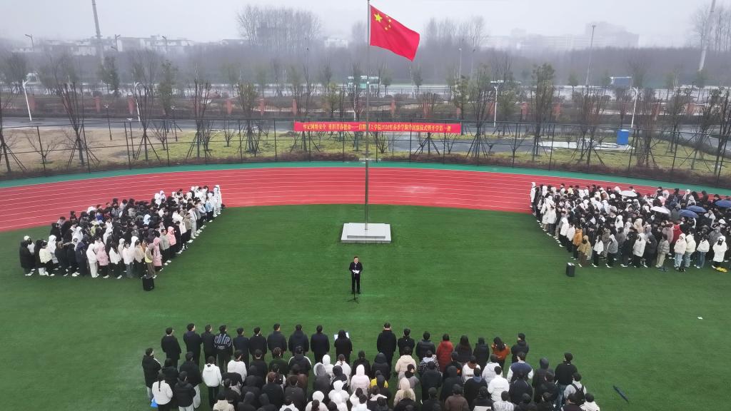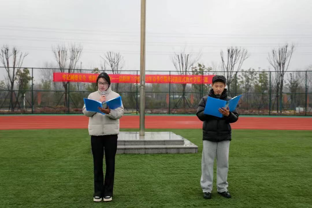春雨如酥润无声,跃马扬鞭启新程。3月2日,新学期开学第一天,信阳理工学院在东区体育场举行“牢记网络安全 勇担青春使命”2026年春季学期升国旗仪式暨开学第一课。学院党政领导班子,全体教职工和2024级、2025级800余名学生共同参加此次活动。仪式由学院学生工作部部长耿晓菊主持。