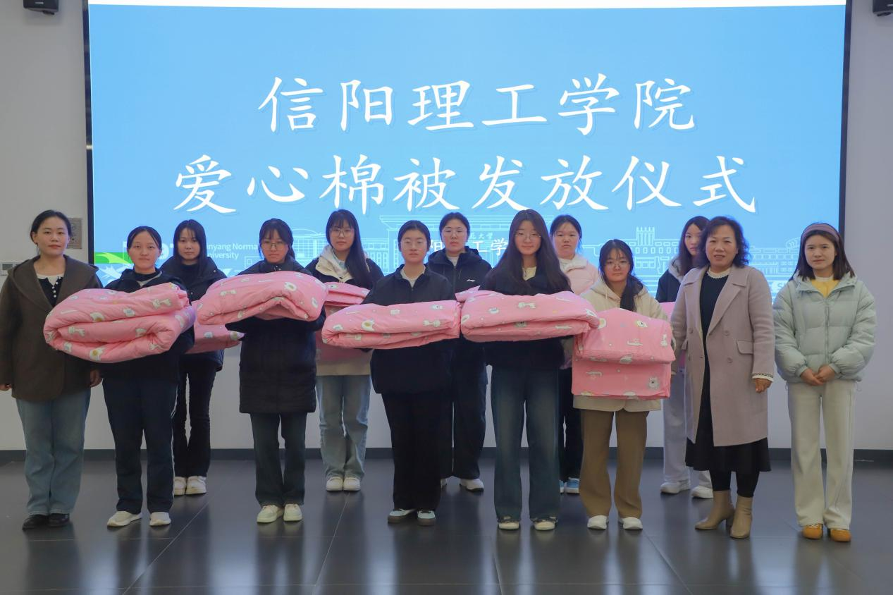 11月18日,信阳理工学院在后勤服务楼举行“寒冬送温暖”爱心棉被发放仪式,助力家庭经济困难学生温暖过冬。学院纪委书记、学生工作部部长耿晓菊,辅导员及受助学生代表共同参加。