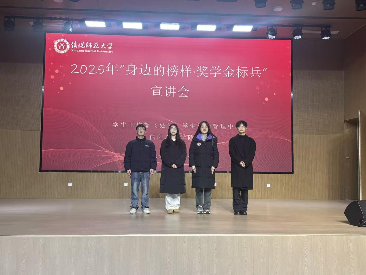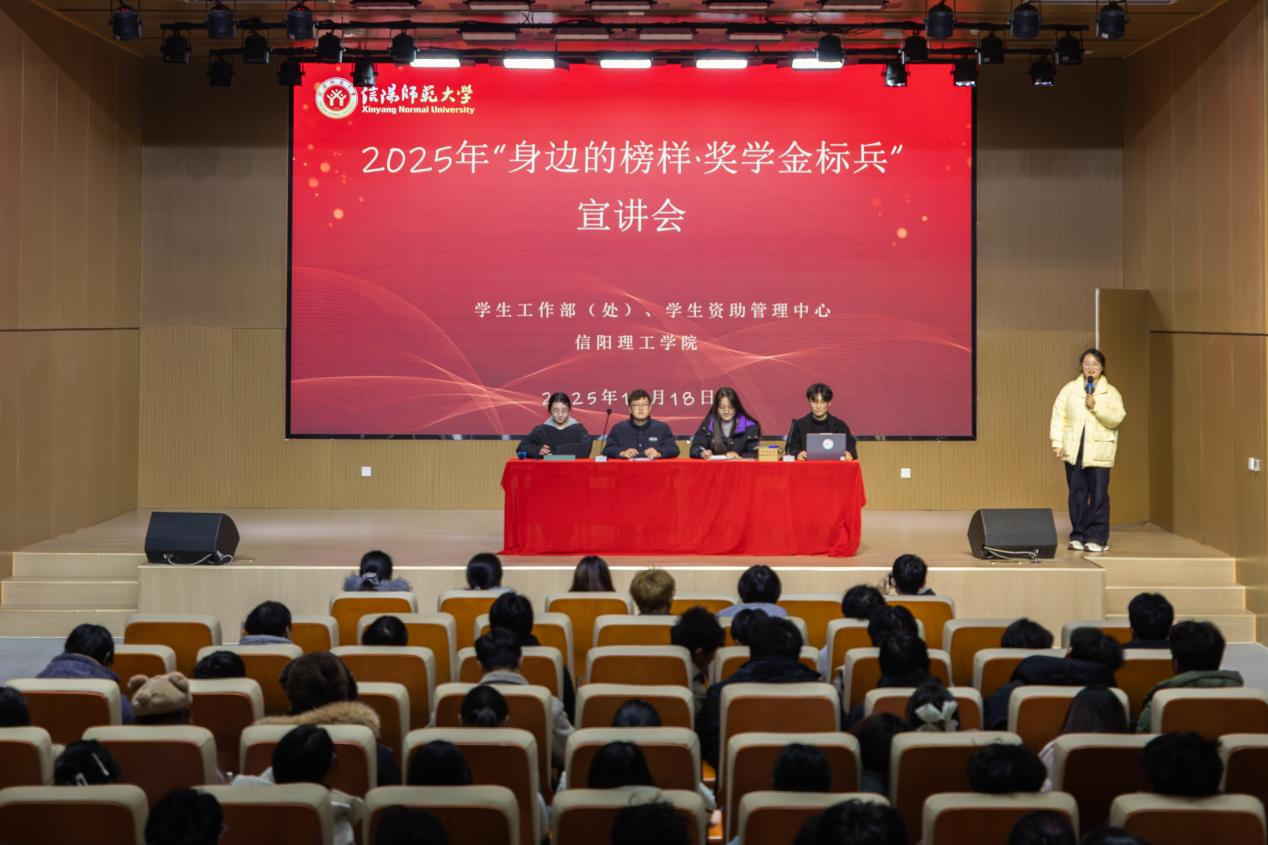 12月18日晚,信阳理工学院在B2教学楼报告厅举办2025年“身边的榜样・奖学金标兵”宣讲会。学院专职辅导员、奖学金标兵及学生代表共300余人参加活动。